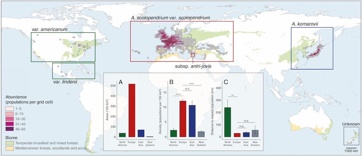 The research findings illustrate that the Hart’s-tongue fern complex prefers specific bioclimatic conditions, being most abundant in temperate broadleaf and mixed forests scattered across regions of the Northern Hemisphere. The uneven distribution of these habitats explains the scattered global abundance pattern of Hart’s-tongue ferns.