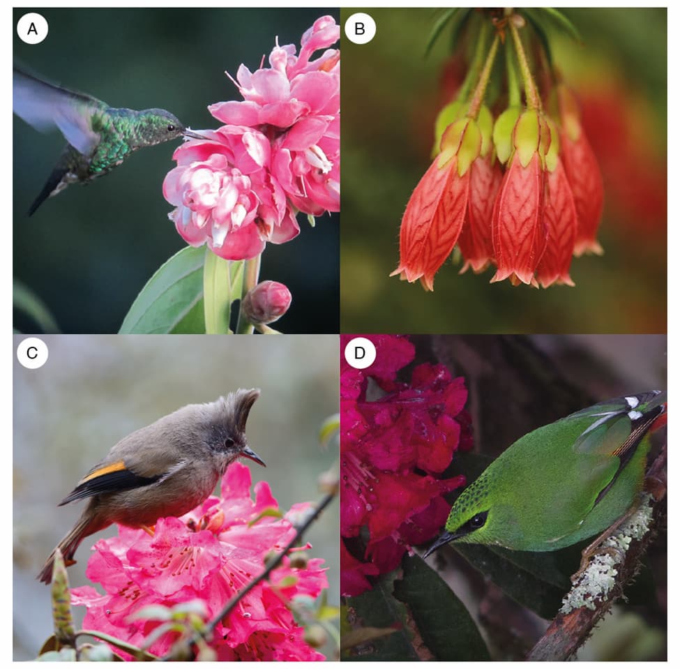 In the Himalayas, Rhododendron species develop reddish, non-pendulous flowers pollinated by nectar-feeding birds. However, Agapetes species form red and pendulous flowers, but birds do not appear to access these flowers. Therefore, this plant might rely on another pollinator capable of hovering during flight. Surprisingly, botanists observed that Agapetes flowers resemble species from the tropical region of the Americas, characterised by nectar production, long brightly coloured corollas, and orientations that suggest accessibility to visitors like hummingbirds.
