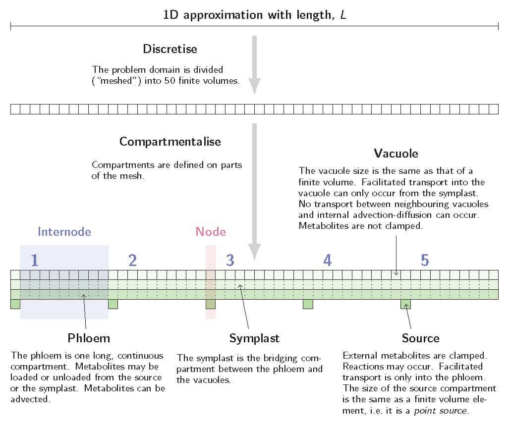 Sucrose transport between the compartments was described using advection-diffusion-reaction (ADR) behavior modelled with partial differential equations (PDEs). This allowed molecule movement to be described as advection (with solutes carried by the bulk flow, which is generated by an osmotic pressure gradient) and/or diffusion (due to a concentration gradient). Detailed kinetic modelling of biochemical reactions describes the interconversion of metabolites in the various compartments.