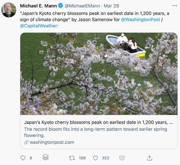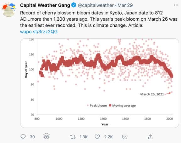 The headline is that this year was the earliest date for Kyoto cherry blossoms, but is that really a signal of climate change? Could it be a freak year? Thanks to another tweet, we can see the year is, in context, part of a long-term trend.