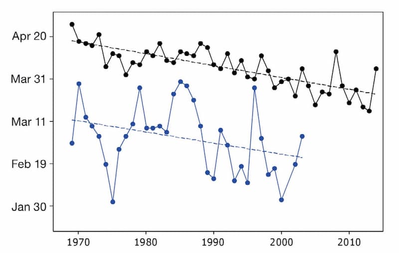 Reality is messier. Leap years muck up the pattern, and the daffodils would come earlier or later from year to year. If you were to graph the flower festival dates, you’d expect shallow downward slopes punctuated by leaps back up or occasional dips down around the peak daffodil date. If the peak flowering day isn’t changing, the plots of the date would be scattered in a horizontal band on the graph. Here’s the graph. You’re looking for the black line.