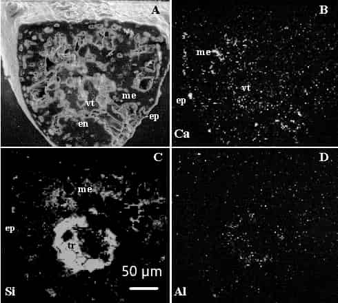 So by 1995 we knew that under some circumstances Si could ameliorate Al toxicity in plants, but we had little idea of the mechanism. David and I were then fortunate to gain some grant funding, and were even more fortunate to have Kay Cocker (now Miller) as our Ph.D. student working on this topic. Kay cracked the problem for us with her highly innovative approach involving Al-induced malate exudation from wheat roots. To cut a very long story short it appeared that the amelioration mechanism involved the formation of non-toxic hydroxyaluminosilicates in the apoplast of the roots. We brought all this work together and wrote it up as a hypothesis. So far the hypothesis has had quite rigorous testing over more than 20 years and it has held up. David and I continued our work on Al-Si interactions for over ten more years, aided by our students Michelle Ryder and Subramaniam Prabagar. Meanwhile, Allan Sangster and I worked on mineral deposition in conifer needles, starting with white spruce, and then a number of other species (e.g. white pine; Fig. 2). Very frequently, we found Al-Si co-deposition in the epidermis or the transfusion tissue.