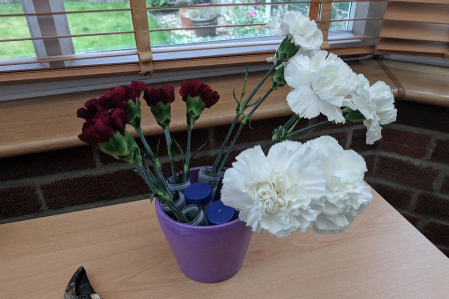 Roses are probably a bad choice of flower if you want a plant that will draw up dye. Growing and selling roses is a global business, so you’re unlikely to get the freshest roses for an experiment. Instead you’ll have quite woody stems. That’s why I chose carnations.