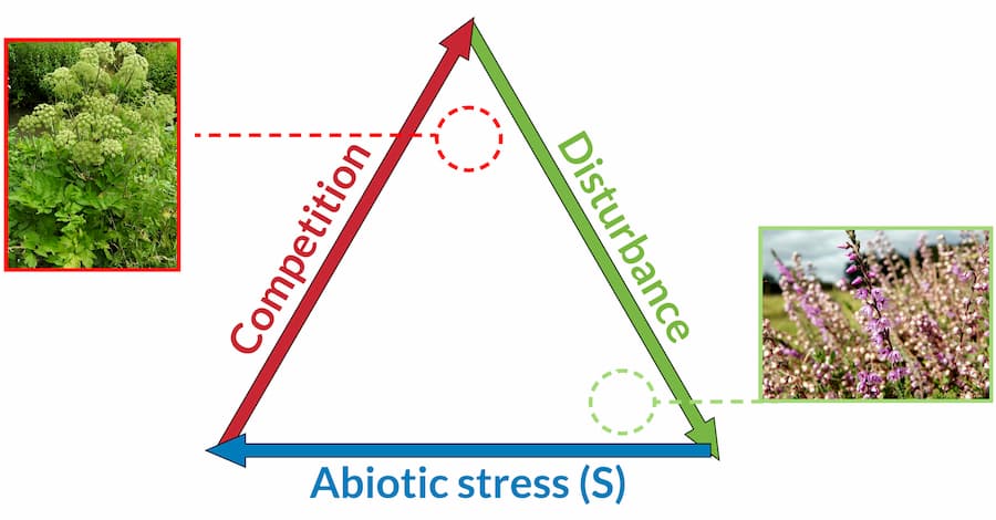 There is a three-way trade-off in adaptive strategies for plants, explained by the CSR (competitor, stress tolerant, ruderal) triangle theory. The triangle represents different trait combinations arising under different levels of competition, abiotic limitation to growth (stress) or periodic biomass destruction (disturbance). Some plants might be better competitors than tolerating disturbance and have different traits.