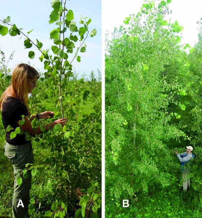 Cole and colleagues set up field trials at Wisconsin Aspen (WisAsp) common garden in 2010 with 1,788 aspen trees from 510 genets. They measured the trees’ growth, defence chemistry, leaf morphology, flower production, the leaf area lost to herbivory and disease from the juvenile stage until the reproductive stage. Microsatellite markers identified different genotype (i.e. genets) and the heritability of intraspecific variability was investigated.