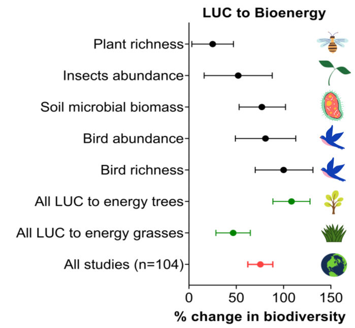 These results of our systematic review and meta-analysis are timely after the November COP26 climate change summit in Glasgow, where policymakers are under pressure to raise the level of mitigation actions. At the same time, biodiversity is in a critical condition globally, with one million species of plant and animal at risk of extinction. The implications of our results for policy makers are that farm-scale biodiversity can be supported as bioenergy crops are expanded in the landscape, providing that agricultural land can be freed-up. However, there are potential risks associated with large field sizes or monocultures of bioenergy crops. Meanwhile, we find a crucial knowledge gap of the cultural ecosystem service impacts of non-food bioenergy crops and further public engagement is required to determine the visual impact and public acceptability of these crops in local communities.