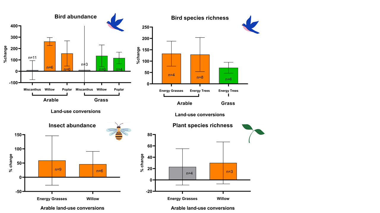 We completed the first meta-analysis to understand the biodiversity impact of growing non-food bioenergy crops on food-based agricultural land (managed grasslands or arable crops), instead of natural ecosystems. Screening over 4,000 studies for our meta-analysis, we used data from 21 field-based studies which met our strict screening criteria. Our study exclusively looked at non-food or dedicated bioenergy crops, including energy grasses of Miscanthus and switchgrass and short-rotation energy trees of willow and poplar.