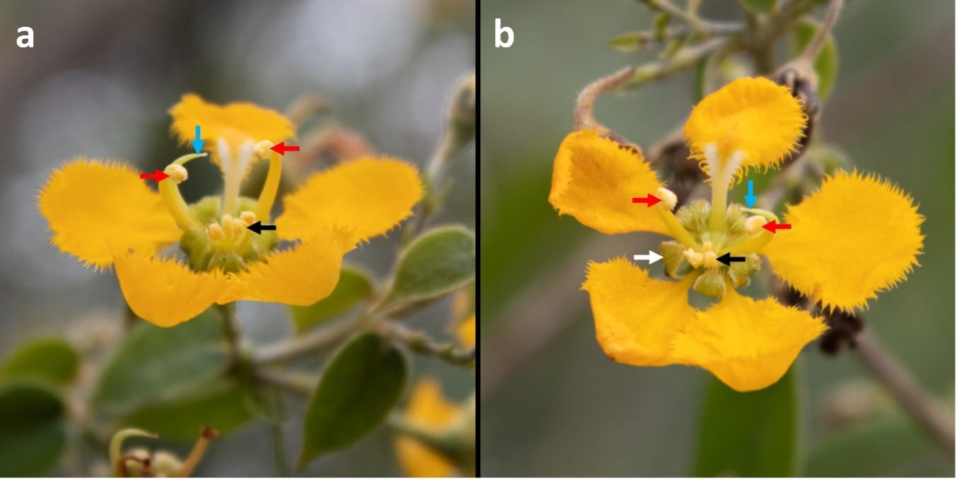 To describe this floral system, the researchers studied the floral morphology, reproduction, and floral visitors of the J. anisandra population. In their study, they found that, like most neotropical species in the Malpighiaceae family, J. anisandra flowers have five petals and four pairs of oil-producing glands in the calyx, known as elaiophores. However, when they characterized the reproductive structures, they found something surprising and previously unrecorded in neotropical species of this family.