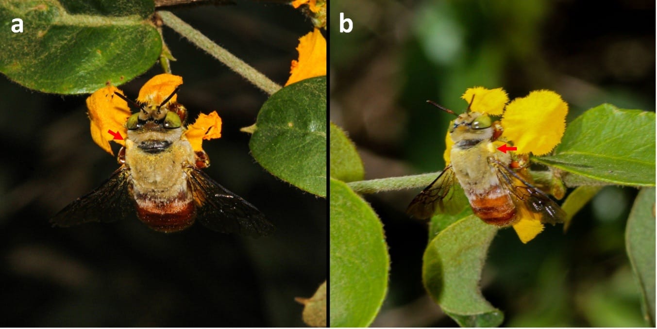 This possibility became even clearer when they observed the floral visitors and potential pollinators of these plants. The researchers recorded four species of bees from the genus Centris, a group known for their close association with oil-producing flowers, as females use them to feed their larvae, construct their nests, or even as food for adults. However, due to the number of visits and their contact with the reproductive structures, they considered C. fuscata and C. aenea as the main pollinators in this population. According to their observations, when these bees visited the flowers, the larger stamens contacted the dorsal part of their bodies, leaving the pollen in safe sites where the pistils would also come into contact. What’s most interesting about this is that since there are two floral morphs, there is an increased probability that, for example, the pollen from flowers with pistils bent to the left will reach pistils of flowers with pistils bent to the right and vice versa, promoting pollination between the two morphs.