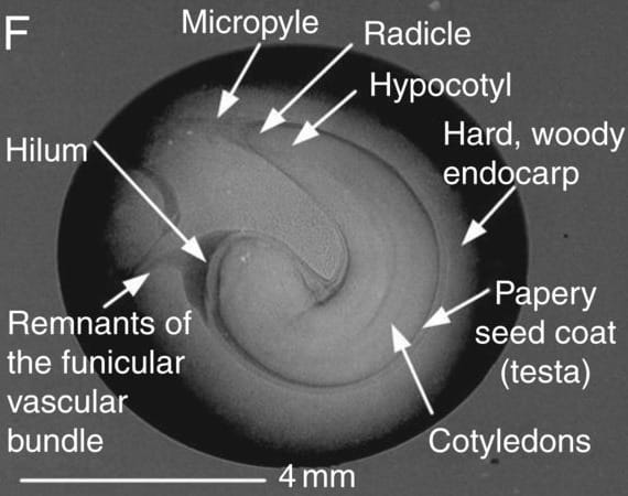 External and internal structure of Persoonia longifolia endocarps and seeds. Aged endocarps with lid detached. Image