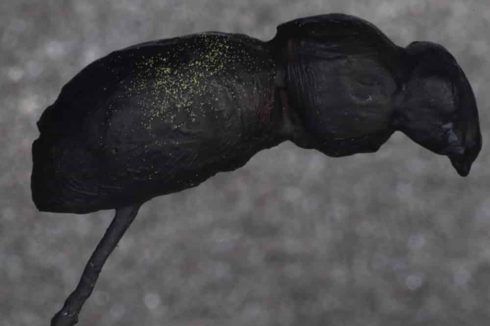 To discover how much these different features contribute to pollen placement, the researchers grew Chamaecrista latistipula plants in a greenhouse and 3D-printed bee models based on the plant’s main pollinators. These models were mounted on vibration speakers that simulated the bees’ buzzing movements. Each flower was gently mounted on a vibrating bee, and the researchers tested different combinations: in some cases, the cucculus was left intact; in others, it was deflected. They also sealed off the short or the large anthers to test each stamen type on its own. After each simulated visit, they dusted the artificial bee with fluorescent powder to mark where a real flower’s stigma would touch. Then they photographed the bee from multiple angles to determine how much pollen was deposited on different body regions—and, more importantly, how closely that aligned with the spot where it’s most likely to reach another flower’s stigma.