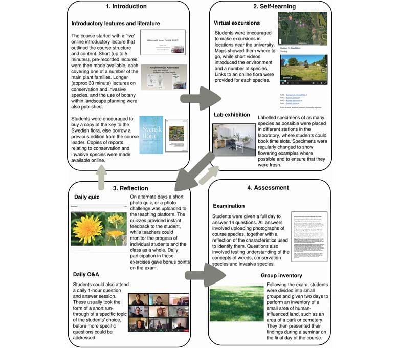 Outline of distance-learning method for field botany 2020. Students are given a background introduction in the subject before self-learning plant species identification using different methods. Continual reflection and self-assessment allows students to track and evaluate their learning, allowing them to revisit teaching materials as necessary. The examination allows students to show that they remember a number of plant species, describe and reflect on that knowledge. The group inventory gives an opportunity to apply the knowledge that they have gained. Image credit: Auffret et al.