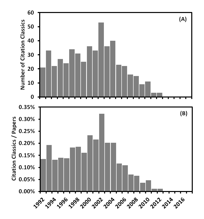 I then calculated the number of Citation Classics in each year to answer the naïve question: How long does it take to become a Citation Classic in Plant Sciences? The most recent papers on my list were from 2012 and the number per year gradually increased as one went back in time to about 2004 after which it became roughly constant (Figure 2A). In doing this analysis I noticed that between 1992 and 2004 the average number of Citation Classics was about 0.2% of the total number of papers published each year, or 1 in 500 papers (Figure 2B). This is one fifth of the 1% of papers that are designated “Highly Cited” on Web of Science.