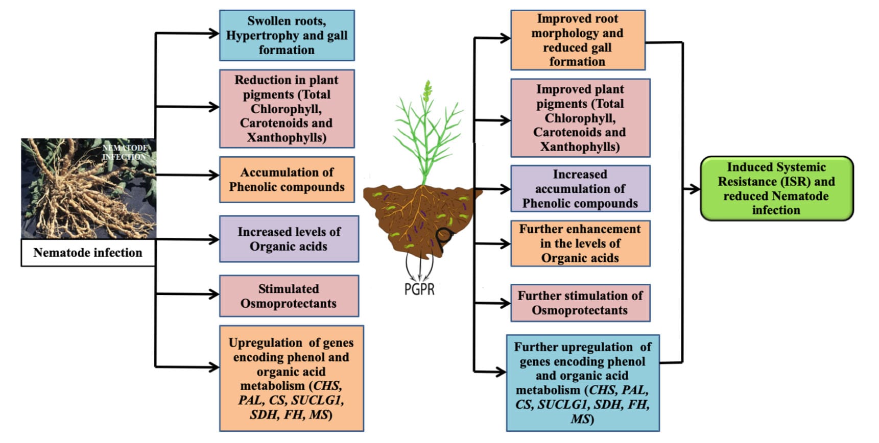In a new study published in AoBP, Khanna et al. sought to explore eco-friendly methods to control RKN infection using rhizobacterial strains (Pseudomonas aeruginosa and Burkholderia gladioli). These strains were inoculated in RKN infected tomato (Lycopersicon esculentum) plants and the extent of their infection was noted by assessing different plant parameters, such as leaf concentrations of photosynthetic pigments, phenolic compounds, osmoprotectants and organic acids. Transcriptomic analysis was also conducted to evaluate the expression levels of genes associated with phenol and organic acid metabolism. The study revealed that nematode-infected seedlings had reduced levels of plant pigments whilst all other analysed compounds were enhanced in RKN infected plants. Inoculation with PGPR resulted in the activation of defence responses in nematode-infected seedlings by increasing the levels of all analysed compounds. The accumulation of metabolites in plants subjected to nematode infection and inoculated with PGPR shows that this is an effective strategy to overcome nematode stress. The authors conclude that PGPR play a valuable role in stress alleviation for nematode-stressed L. esculentum seedlings and that future work should focus on understanding the mechanisms underlying the nematicidal activities of PGPR.