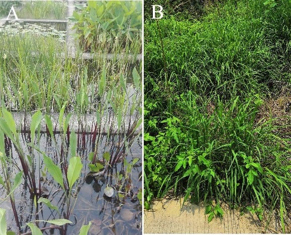 In their recent study published in AoBP, Zhao et al. analysed leaf vein and stomatal characteristics of 14 emergent aquatic and 13 terrestrial monocotyledonous herb species. They found that emergent aquatic species had significantly higher stomatal density and stomatal number per vein length, but a lower mean major vein length per area (VLA) and total VLA than terrestrial species. Stomatal density and total VLA were positively correlated among the emergent aquatic species, terrestrial species, but this correlation became non-significant when data from both the groups were pooled. These results show that the differences in water supply between emergent aquatic and terrestrial plants modify the coordination of their leaf veins and stomatal traits.