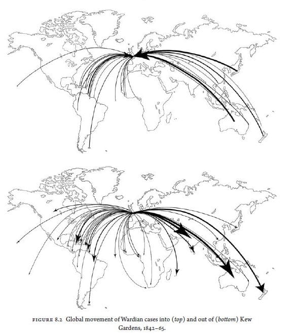 That date of 1834 is particularly significant because it is shortly before Queen Victoria ascended to the English throne in 1837. The resulting Victorian Era coincided with the period during which the British Empire attained its greatest prominence. The Empire’s world-spanning reach supported and enforced by its Royal Navy (“the uncontested superiority of the British navy safeguarded the security of the imperial trade routes on which the life of Great Britain depends” (H Th De Booy, Pacific Affairs 10(2): 161-167, 1937; http://www.jstor.org/stable/2750597)) which effectively ‘ruled the waves’ permitted relatively unhindered passage of people, property, and plants between England and its many overseas ‘possessions’. Importantly, many of those colonies were in tropical climes, which were also therefore eminently suitable for growing plants not native to those lands but which might be ‘acquired’ from countries in similar latitudes elsewhere that were not controlled by Britain. With this political and climatic background, it’s probably no surprise that one of the earliest – and most prolific users, of the Wardian case was Great Britain. This is graphically underlined by Figure 8.2 in Keogh’s book [reproduced below] which shows the extent of the global movement of cases into and out of Kew Gardens from the British Empire’s outposts between 1842 and 1865, with each box potentially containing between 25 and 60 species.