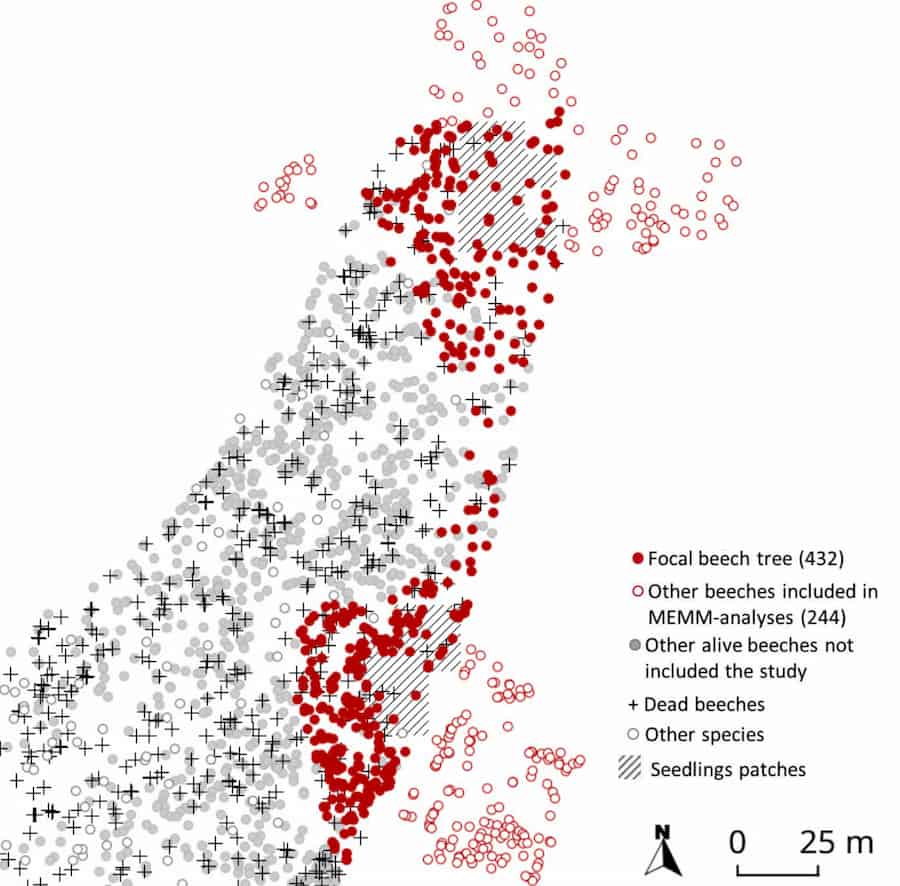 The team established the origin of 365 seedlings with genotyping, and the reproductive success of male and female trees was analysed with Mixed Effect Mating Models (MEMMs). All this data was used to investigate the impact of environmental conditions on tree growth and reproduction.