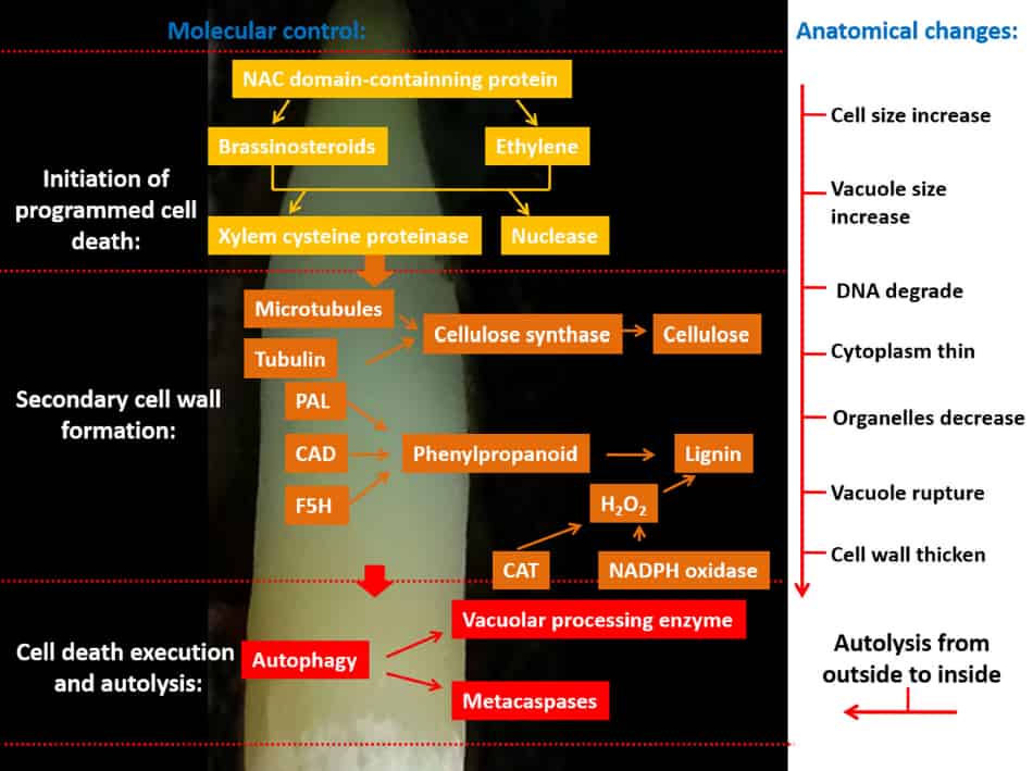 Step 2: The secondary cell wall is formed through a series of significant anatomical changes, including DNA degradation, thinning of the cytoplasm, organelles decrease, vacuole rupture, and finally cell wall thickening. The authors also found “changes in the expression of genes related to the biosynthesis of cellulose and lignin, which are instrumental in the formation of secondary cell walls”.