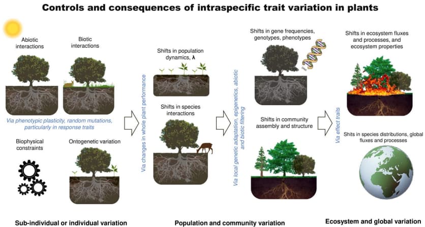 “In other words, in this review we focused on studies from the community ecology and trait-based ecology literatures where interest in ITV has been surging over the last several years. But we are well aware that evolutionary biologists and population biologists/demographers explicitly consider intraspecific variation, and so we introduce the paper by first exploring the rich history of examining intraspecific variation in plants. Along the same line, designing a conceptual figure that brought together these fields of study was also challenging, and we went through several iterations of the figure to ensure that it was sufficiently synthetic and broad in scope.”