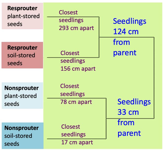 Lamont and Witowski found that the seedling to adult distance (S-A) is generally the direct function of interseedling distance (S-S) and interadult distance (A-A) and inverse function of seedling to parent ratio (S/A) between species and functional types. The resprouters’ crowns, weight of seeds and rootstocks were four, over four and 80 times larger than non-resprouters respectively. Most non-sprouting seedlings were beneath or close to the adult plants whilst resprouters were further away from the adults. Resprouter seedlings tended to be randomly scattered, up to 8 m away from the adults.
