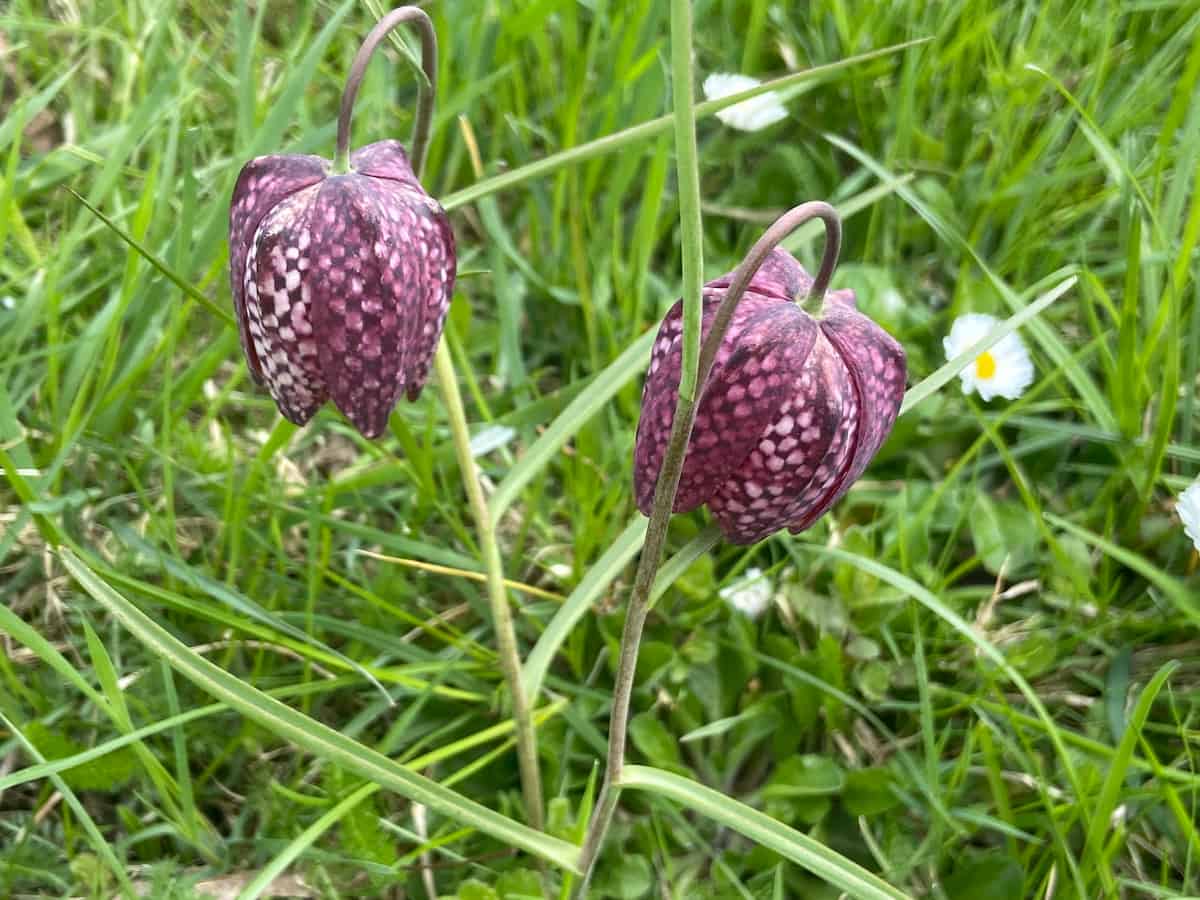 The common name for the plant in the UK is the Snake’s Head Fritillary, but the chequered pattern shows why it can be known by other names, like Chequered Daffodil or Chess Flower. The epithet, meleagris, means “spotted like a guineafowl”.