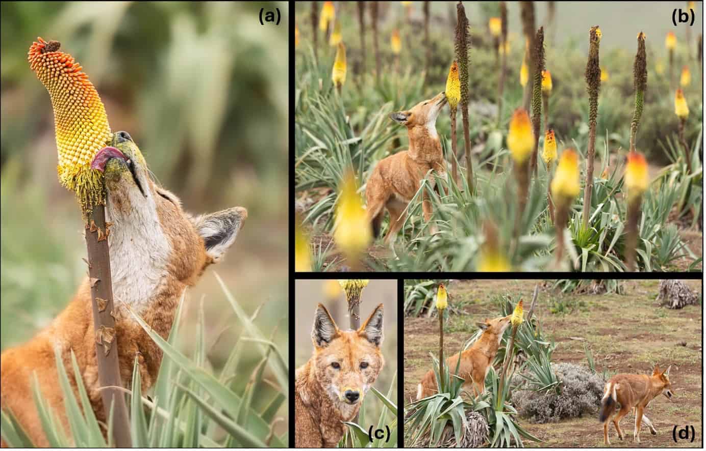 Ethiopian wolves sipping nectar from the flowers of Kniphofia foliosa. Photos from Lai et al. (2024).