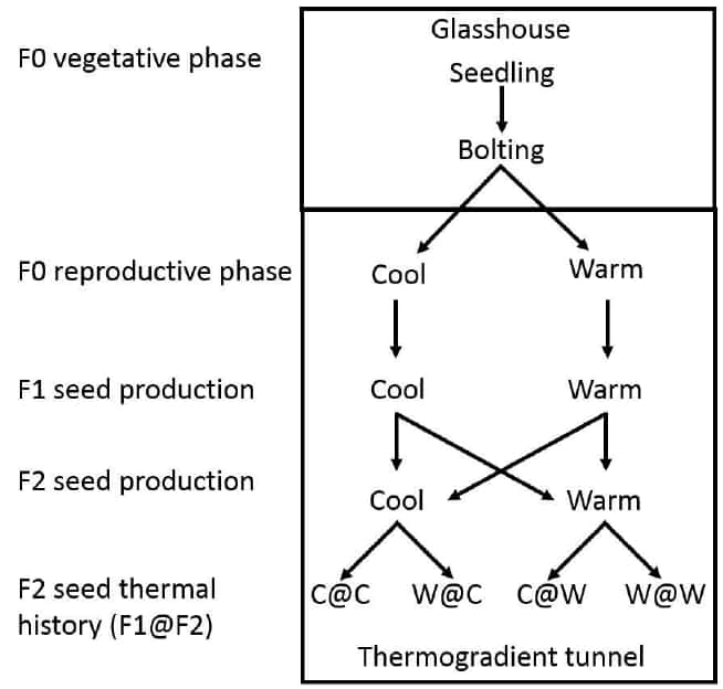 Researchers used two Arabidopsis thaliana ecotypes adapted to the warm/dry Cape Verdi Islands (Macaronesia; Cvi), and the cool/wet climate of the Burren (Ireland; Bur). The scientists created a thermogradient tunnel with a thermal gradient of +4°C to produce a realistic global warming scenario for the experimental area between 2011-13 and 2080. Trays of 24 plants were placed at the cool/ambient (C) end and the warm (W) end of the tunnel. Flowering time, plant biomass, height and seed yield were measured. Researchers collected the mature seeds of the first population (F1), and then used the F1 seeds to grow plants again in the tunnel. Seeds were collected again from the second population (F2) and seed germination and seedling emergence was tested.