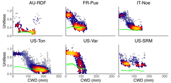 But here’s the catch: in most arid sites, after an initial drop, the relationship between fET and the cumulative water deficit seems to level off (Figure 1). But why?