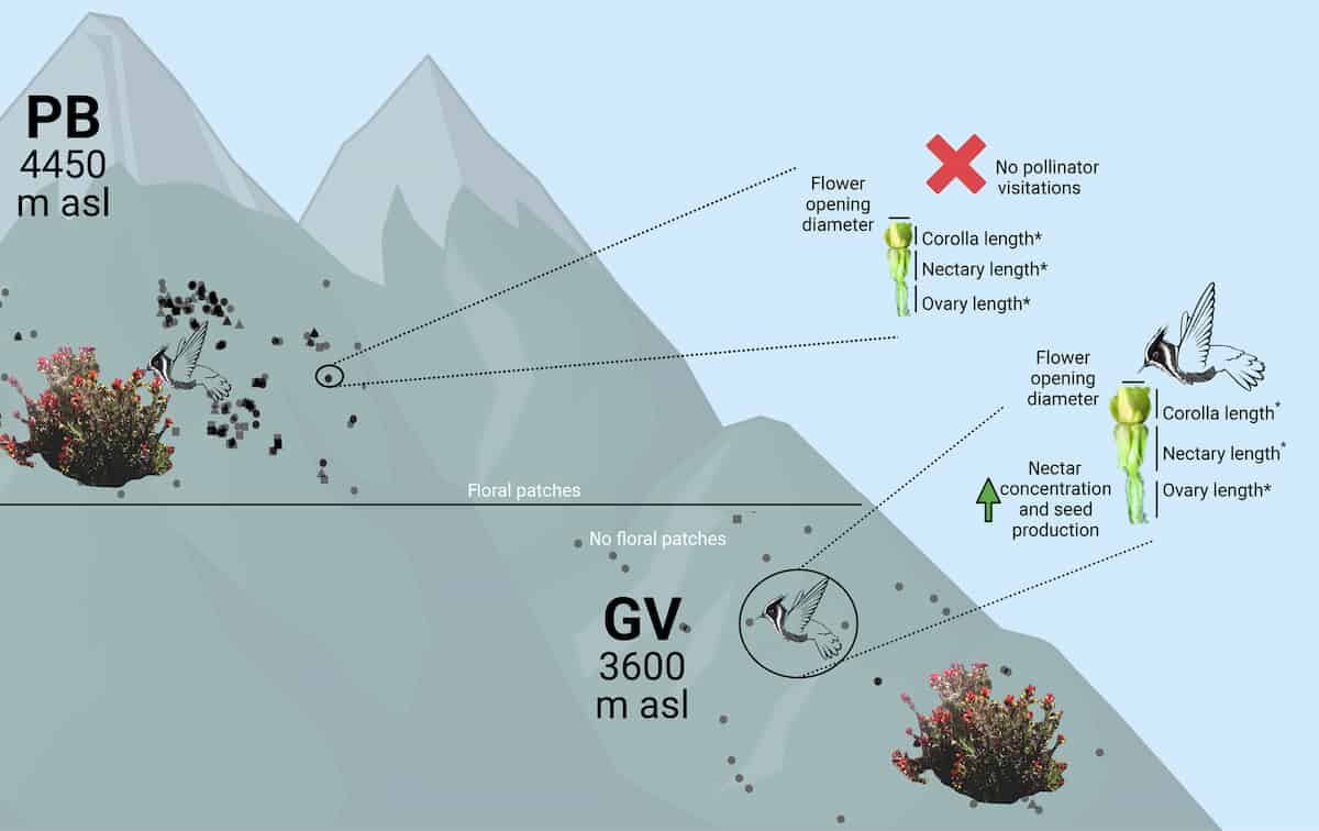 To understand how altitude influences floral traits, pollinator interactions, and reproductive success in plants, Gisela T. Rodríguez-Sánchez and her team studied Oenothera epilobiifolia, a hummingbird-pollinated plant from the Venezuelan Andes. They focused on two populations: one at 3600 meters in Gavidia and another at 4450 meters in Piedras Blancas. The researchers conducted field observations, measurements, and experiments.