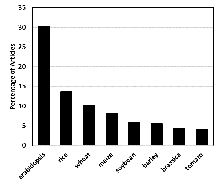Figure 4. The percentage of papers listed in the Web of Knowledge Core Collection on the ionomics, elementomics, nutriomics or metallomics of plants that included explicit mention of the plants listed.