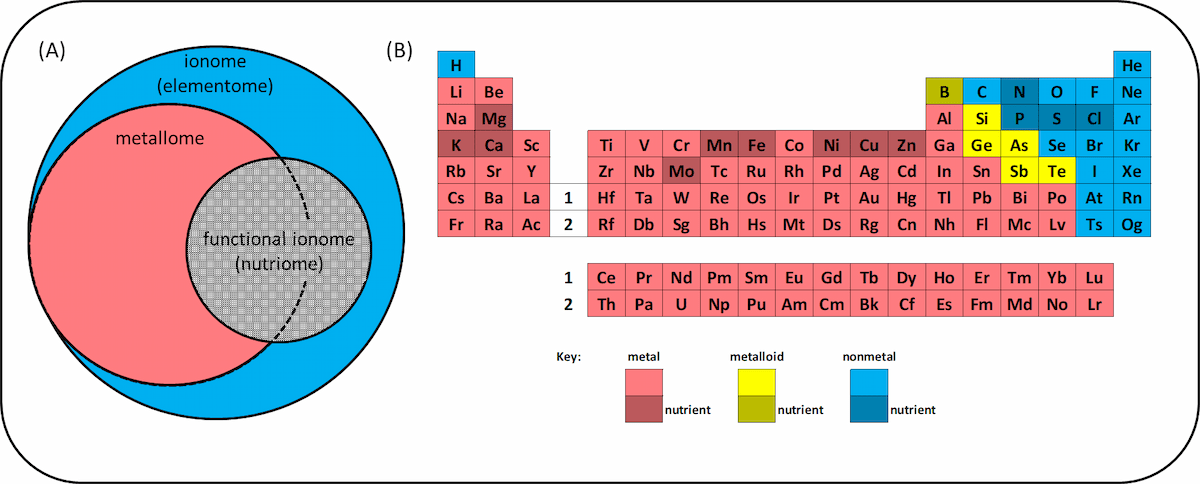 Figure 1. (A) Relationships between the terms ionome, elementome, metallome, functional ionome and nutriome. (B) Periodic table of the elements illustrating metal, metalloid and nonmetal elements, with the mineral elements essential for plant nutrition indicated by stippling.