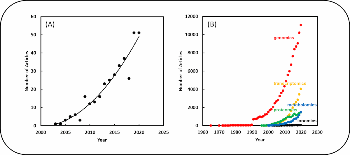 Figure 2. (A) The number of papers listed in the Web of Knowledge Core Collection on the ionomics (ionomics, elementomics, nutriomics or metallomics) of plants each year since 2000. (B) The number of papers listed in the Web of Knowledge Core Collection on genomics, transcriptomics, proteomics, transcriptomics or ionomics since 1960.