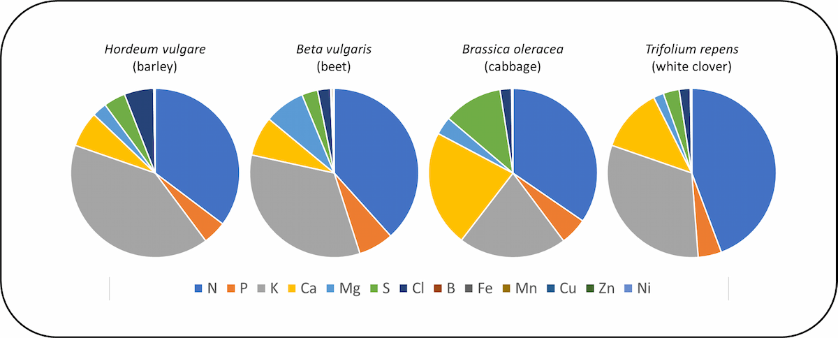 Figure 3. The functional ionomes of different plant species. The ionome of barley is dominated by potassium (K). The ionome of beet contains much magnesium (Mg). The ionome of cabbage is characterised by abundant calcium (Ca) and sulfur (S). The ionome of white clover has relatively more nitrogen N than other species. Data from Neugebauer et al. (2018).