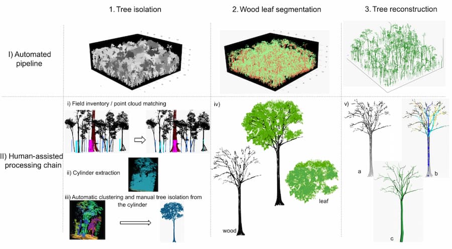 The scientists tested five fully automated pipelines using different software, algorithms and settings. The three main steps were to first localise and isolate individual trees from the LIDAR-generated 3D point cloud, segment the leaves and the wood, and reconstruct trees using quantitative structural modelling.