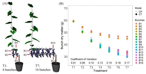 Next, they compared the models when canopy architecture was heterogenous to elucidate the effects of the proximity of bunches to the carbohydrate sources. The distance between fruit and carbohydrate sources increased with crop load. The uniform bunch dry matter obtained by the CP model was statistically equal to the mean bunch dry matter value obtained by the CT model for each crop load treatment. However, the simpler CP model was not able to capture the increasing coefficient of variation in bunch dry matter as the crop load increased as revealed by the CT model.