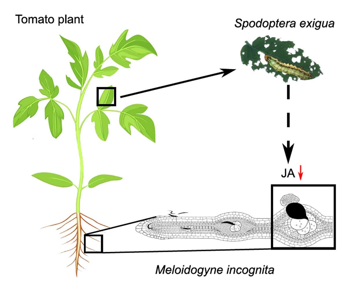 Root-knot nematodes (RKN) are plant parasites that damage the roots of the host plant. RKN infection impairs movement of water and minerals from roots to shoots, which can limit plant productivity and fitness. While the roots are being infested by nematodes belowground, plant leaves aboveground can be attacked by herbivorous insects, such as caterpillars. The loss of leaf material due to caterpillar feeding can also adversely impact plant productivity. Together the damage caused by RKN and herbivorous insects can reduce crop production by 20 %. Pesticides can be used to control these pests however, whilst often effective, these can have negative impacts on human and environmental health. Efforts to identify natural plant resistance traits for these pests and interaction between RKN and caterpillars may help us to develop sustainable pest management strategies.
