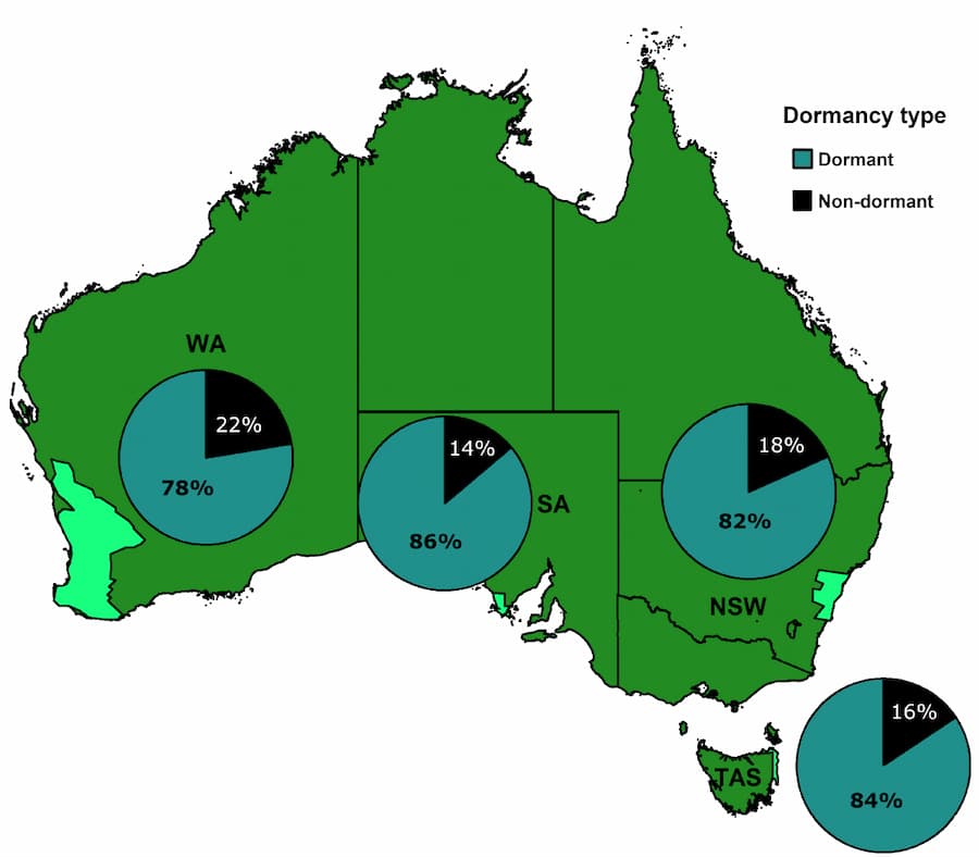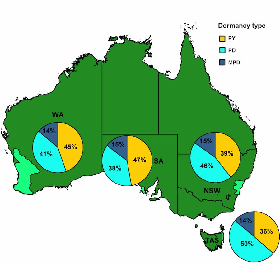 Most of the shrub species (79.4%) produced dormant seeds across Australia and overall, dormancy was more likely in cooler areas. Rainfall seasonality could have explained the distribution of shrubs with physiological and physical dormancy.