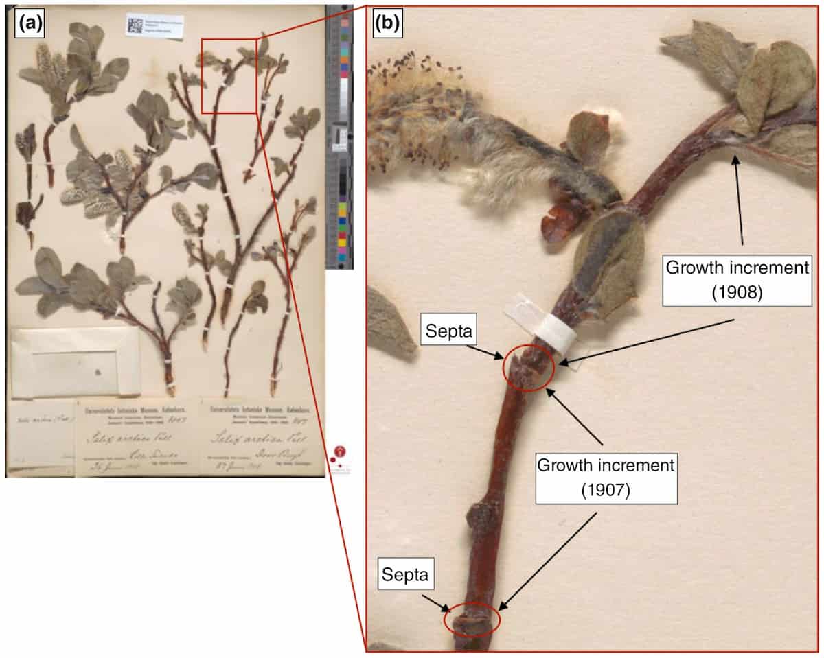 Ahlstrand and her team measured 482 Salix herbarium specimens belonging to: S. arctica, S. glauca, S. herbacea, and S. arctophila, that were collected between 1833 and 1993. They choose this group because it is common across Arctic regions and growth is easily measured in digital herbarium specimens. Whilst the number of specimens varied between species, the team found between one and nine years of growth in a single specimen.