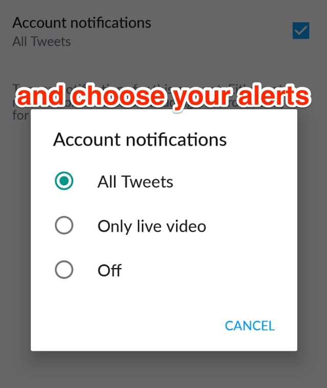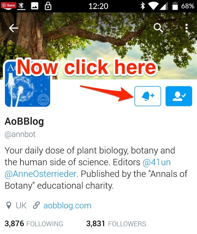 On your mobile, once you followed a Twitter account, you will see one or two additional buttons appear . To turn on notifications, click the that looks like a bell. This will bring up a menu, where you can choose which notifications to turn on. By selecting notifications for ‘All Tweets’, I now will receive notifications on my phone the same way I’d receive a text or email notification. Every new blog post on AoBBlog is announced by updates on social media, so by following these steps, you’ll make sure to never miss another post!