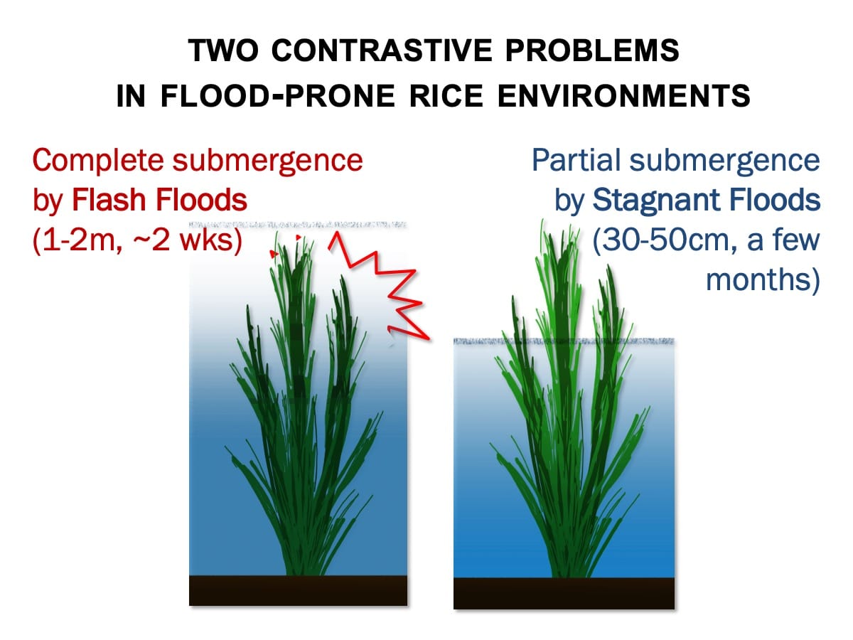 Rice ecosystems in the tropical coastal areas are subject to flooding, but not all flooding is the same. Sometimes the plants are overwhelmed by water for a short time. Another way they experience flooding is through long-term partial submergence (stagnant flooding). Yoichiro Kato and colleagues have been studying SUB1, a region of the genome that improves submergence tolerance in rice. They wanted to see if Sub1 rice varieties could also be bred to tolerate stagnant flooding.