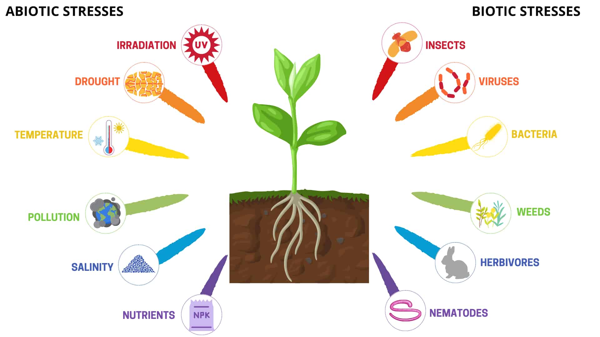 Throughout their lives, plants are exposed to a wide range of environmental challenges that can affect their growth and jeopardize their health. These external threats can be categorized as abiotic stresses if caused by “non-living factors” (e.g., freezing/chilling or heat, water deficit or flooding, UV radiation, soil salinity, nutrient deficiency, air pollution and soil contamination) or as biotic stresses if caused by “living factor” (e.g., viruses, bacteria, fungi, nematodes, insects, weeds).