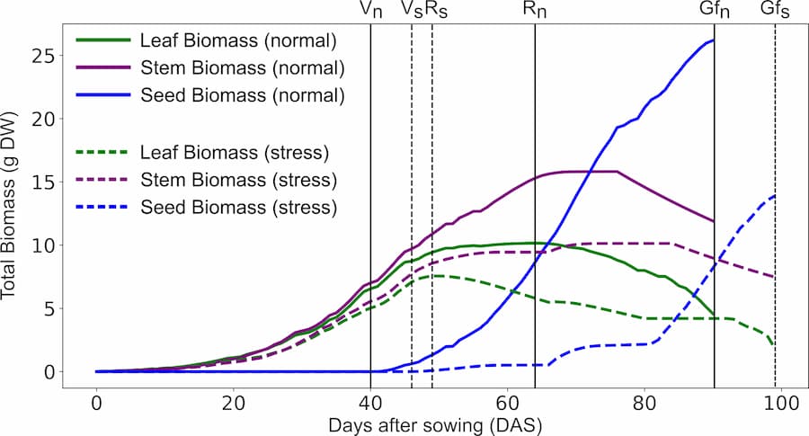 Las simulaciones muestran que las plantas con estrés hídrico tuvieron una tasa de crecimiento menor y un periodo de crecimiento más corto, lo cual tuvo como resultado una menor biomasa total en comparación con condiciones normales. A su vez, la biomasa más baja tuvo menor asimilación, transporte y el almacenamiento de N y C lo que resultó en rendimiento reducido.