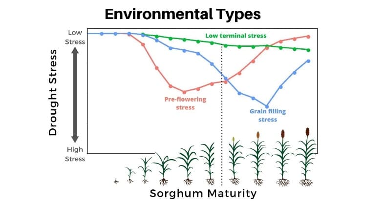 Although sorghum is drought resistant relative to other crops, drought can reduce sorghum yields. Sorghum sensitivity to drought stress is greater during reproductive stages than during the vegetative stage. Drought frequency and severity are expected to worsen with climate change.