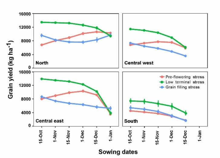 Optimizing sowing date provides a drought escape strategy to reduce the impact of the different water stress patterns. Choosing the correct sowing date and genotype can increase yield by 5,049 kg ha-1 (see figure 3).