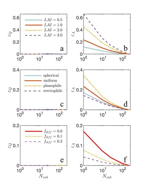 They found that canopy configurations that reduce radiation entropy are more sensitive to error in canopy photosynthesis estimations. Errors were found to increase for canopy configurations (1) with increased LAI, as the canopy became denser, (2) when leaf angle distribution was more horizontal causing the fraction of leaf area projected in the direction of the sun to increase, and (3) when the fraction of incoming diffuse radiation was decreased.