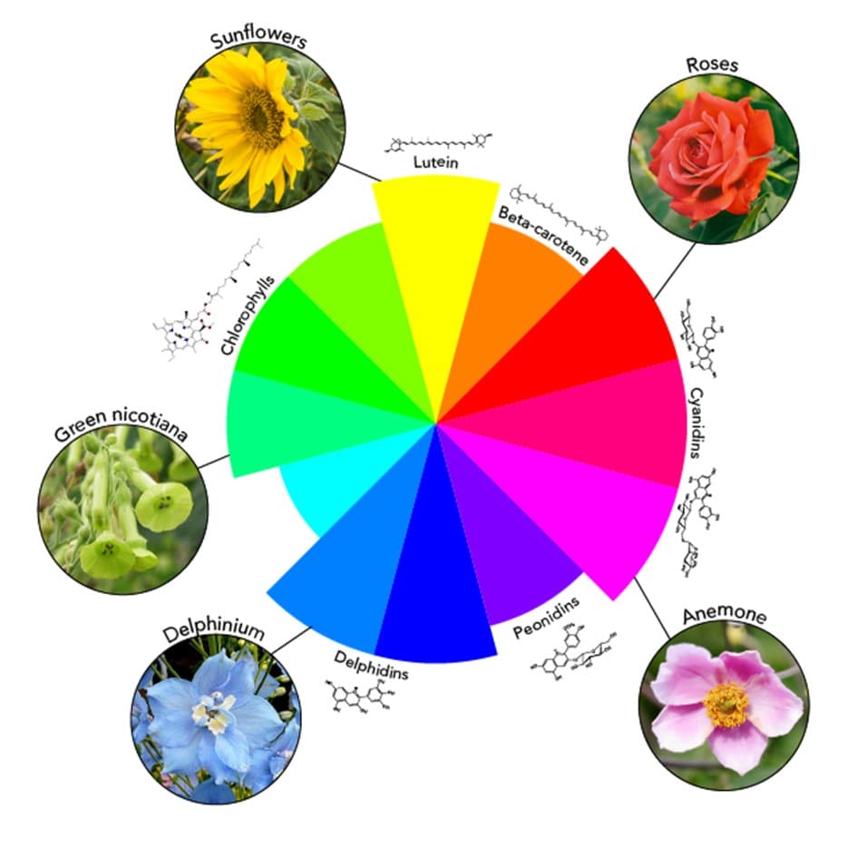 Although we might be able to identify a broad and heterogeneous colour palette in flowers, the truth is that the list of pigments responsible for it is pretty short, including chlorophylls, carotenoids and anthocyanins. The subtle variations in colour shades result from species-specific modifications in the metabolic pathways that produce these pigments. For example, the cyanidin that gives place to red roses might resemble the cyanidin responsible for red dahlias. Still, the structure of each pigment might have little modifications that give place to its differences. Moreover, pigments (and their combinations) can be integrated with other floral characteristics, such as the biophysical properties of petal cells (e.g., velvety surfaces), creating infinite combinations that culminate in the spectacle of colours we see (Figure 2).
