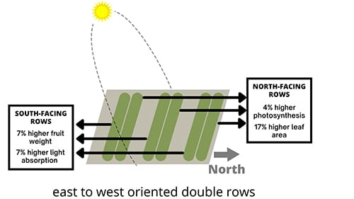 However, the authors did find a difference between east- and west-facing rows oriented north to south. Although south -facing rows had lower leaf area, they had 7% higher ripe fruit dry weight than north-facing rows.
