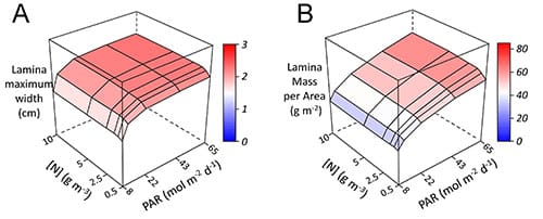 The authors used the modified CN-Wheat to explore how morphogenesis under a variety of growth conditions affected the plasticity of major foliar traits. Simulations were run with plants growing under a range of interacting planting densities, soil N concentrations, and incident photosynthetically active radiation, which is the light available for photosynthesis. The authors then assess the plant’s dimensions, biomass, specific leaf area, and nitrogen content.