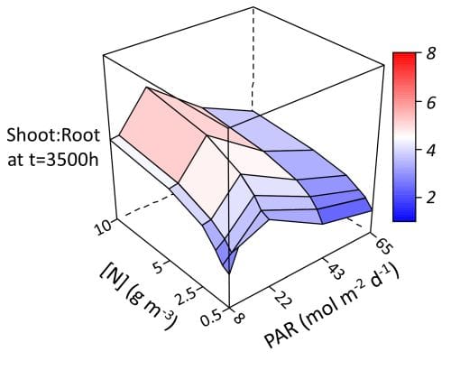 The authors found that the model simulated realistic phenotypic plasticity for contrasting light availability and N fertilization. For example, as a response to increasing incident PAR, the model simulated, at the whole-plant level, a decreasing fraction of dry mass allocated to roots (Fig. 1) and faster leaf emergence, and, at leaf level, thicker and wider leaves (Fig 2). Also, as a response to increasing soil N concentration, the model simulated, at the whole-plant level, a decreasing shoot:root dry mass (Fig. 1) and faster leaf emergence, and, at leaf level, increasing thickness, width and length (Fig 2).