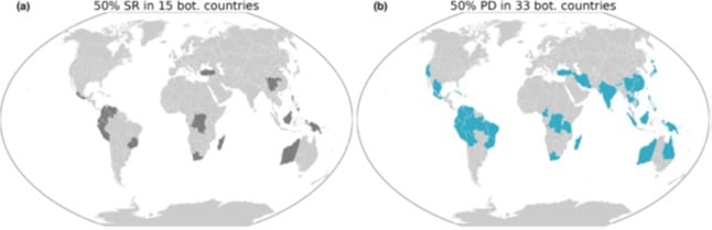 Intriguingly, only 15 botanical countries account for 50% of global Species Richness, but at least 33 countries are needed to provide 50% of global Phylogenetic Diversity (Figure 2), thus stressing the importance of additional regions – such as Sub-Saharan Africa and Australasia – for conservation purposes.